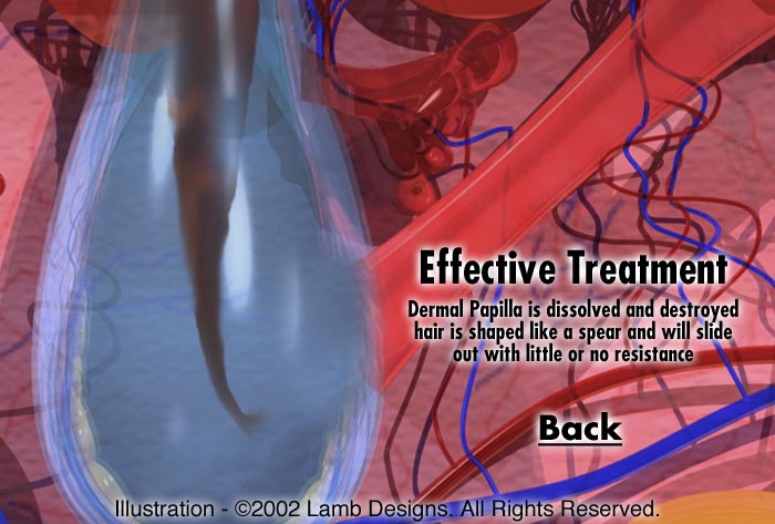 (Dermal Papilla Destroyed) Once the dermal papilla cells have been decomposed, the hair will slide out with little or no resistance. This hair will never regrow, because there are no cells left to form a new hair. It is easy to tell if a hair has been properly destroyed. An untreated hair will have a bulb on the end of it signifying the dermal papilla cells are still intact. A properly treated hair will be shaped like a spear, with no bulb on the end of it. Click here to see micrographs of actual treated and untreated hair follicles... |